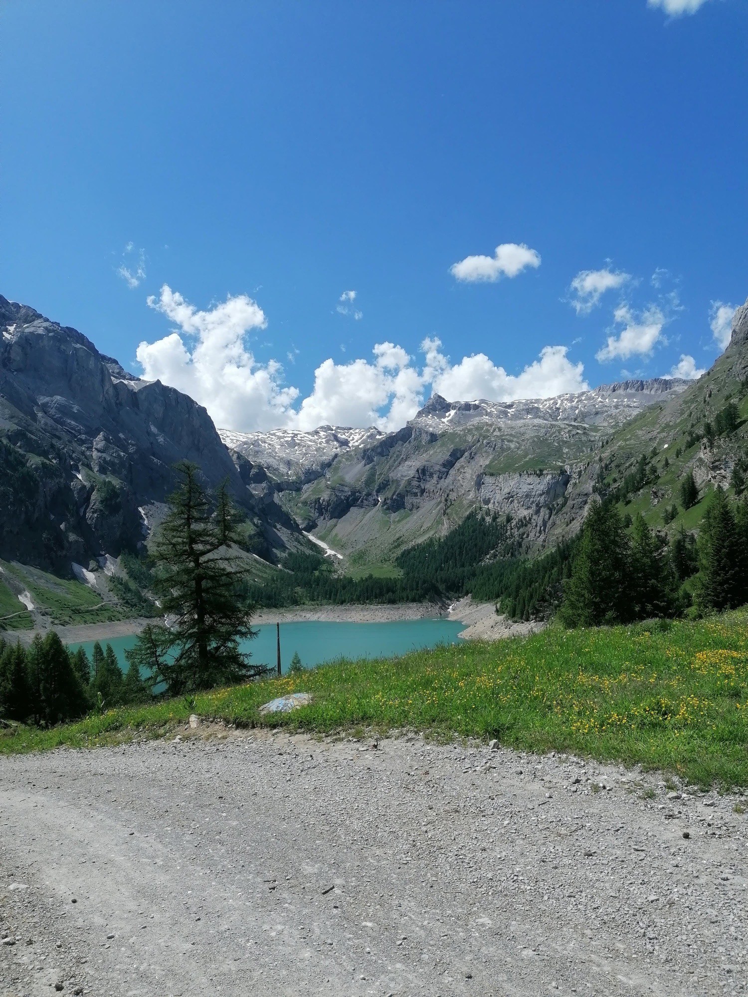 On entame la grande descente vers le lac de Tseuzier, dans un décor spectaculaire : falaise, barrage, reflets turquoise, falaises abruptes.